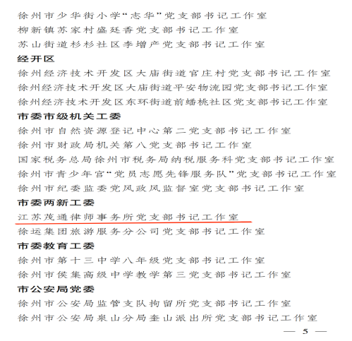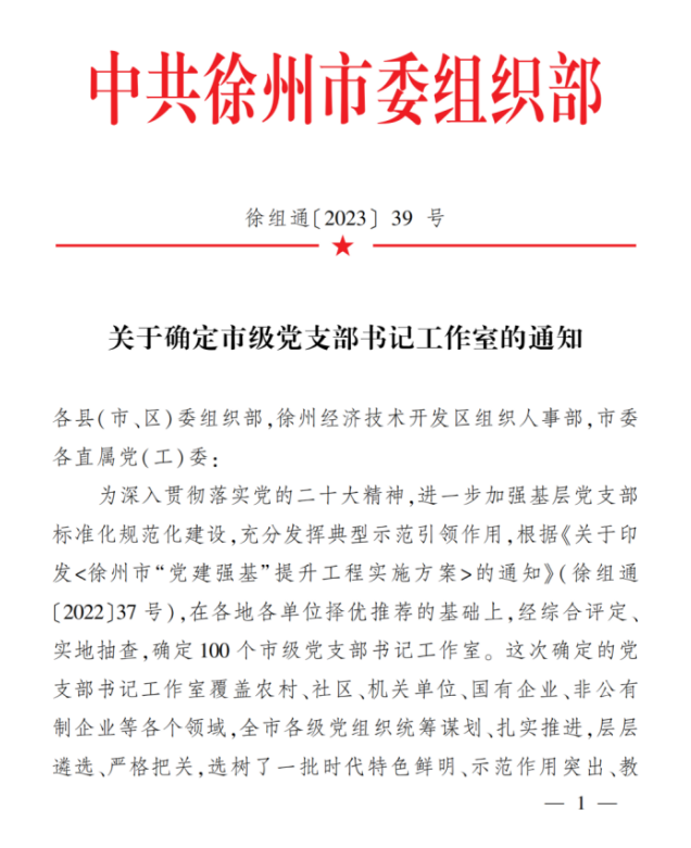 近日,中共徐州市委组织部发布的徐组通【2023】39号文件,关于确定市级党支部书记工作室的通知,999彩票党支部书记工作室光荣地被确定为“市级党支部书记工作室”,成为徐州市律师行业唯一入选的书记工作室。