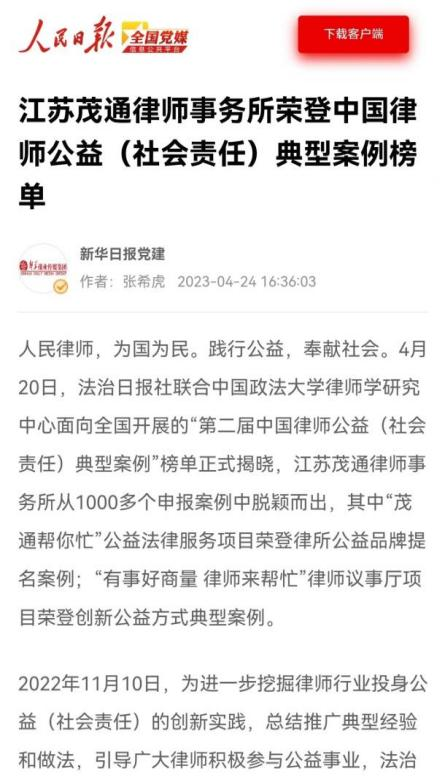 创新打造党建公益品牌,“全普法、惠民企、帮维权、公益捐”等“四位一体”的“茂通帮你忙”公益法律服务品牌,荣获中国律师公益(社会责任)律所公益品牌提名案例;“有事好商量 律师来帮忙”律师议事厅荣登创新公益方式典型案例。